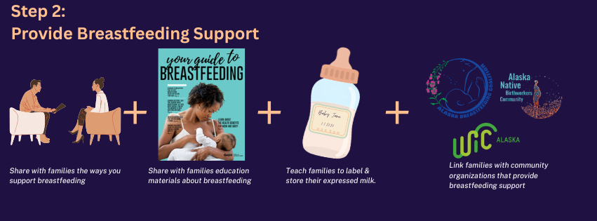 Breastfeeding Welcomed Here for Child Care is a program to help child care providers meet national standards for breastfeeding and support breastfeeding families. The Alaska Breastfeeding Coalition and the Alaska Department of Health are working together to deliver this program.